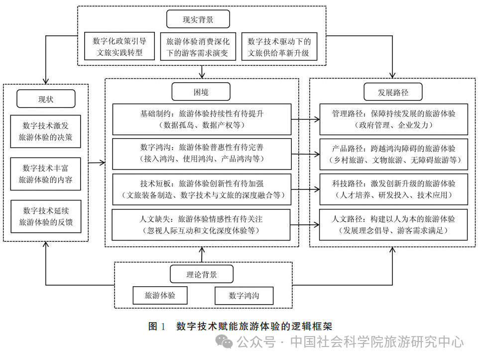 尽管数字文旅研究已取得丰硕成果,但学术界对数字技术如何系统性赋能旅游体验仍缺乏深入分析。鉴于旅游体验在旅游消费中的核心地位以及数字文旅在推动旅游体验创新中的重要作用,数字技术对旅游体验的影响机制研究已经引起关注;同时,考虑到数字技术赋能旅游体验的过程中还存在基础制约、数字鸿沟、技术短板以及人文关怀缺失等问题,因此,有必要遵循“背景—现状—困境—路径”的逻辑框架(图1),深入探讨数字技术赋能旅游体验存在的问题及其发展方向,为旅游体验的持续创新和优化发展提供坚实的理论指导。